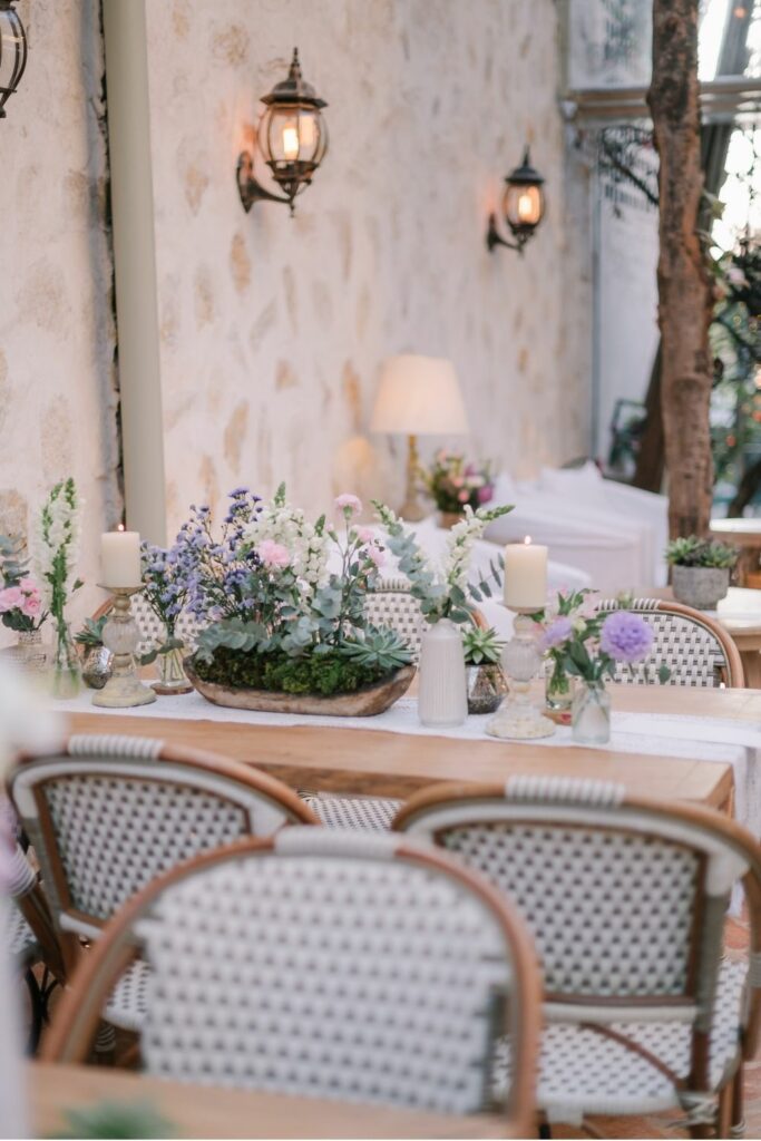 O boho propõe liberdade criativa, mistura de referências e valorização do artesanal. No casamento, isso se traduz em composições menos rígidas, arranjos orgânicos, tecidos fluidos e uma paleta que pode transitar entre tons terrosos, areia, terracota, verde-oliva, rosé queimado e toques de azul suave.