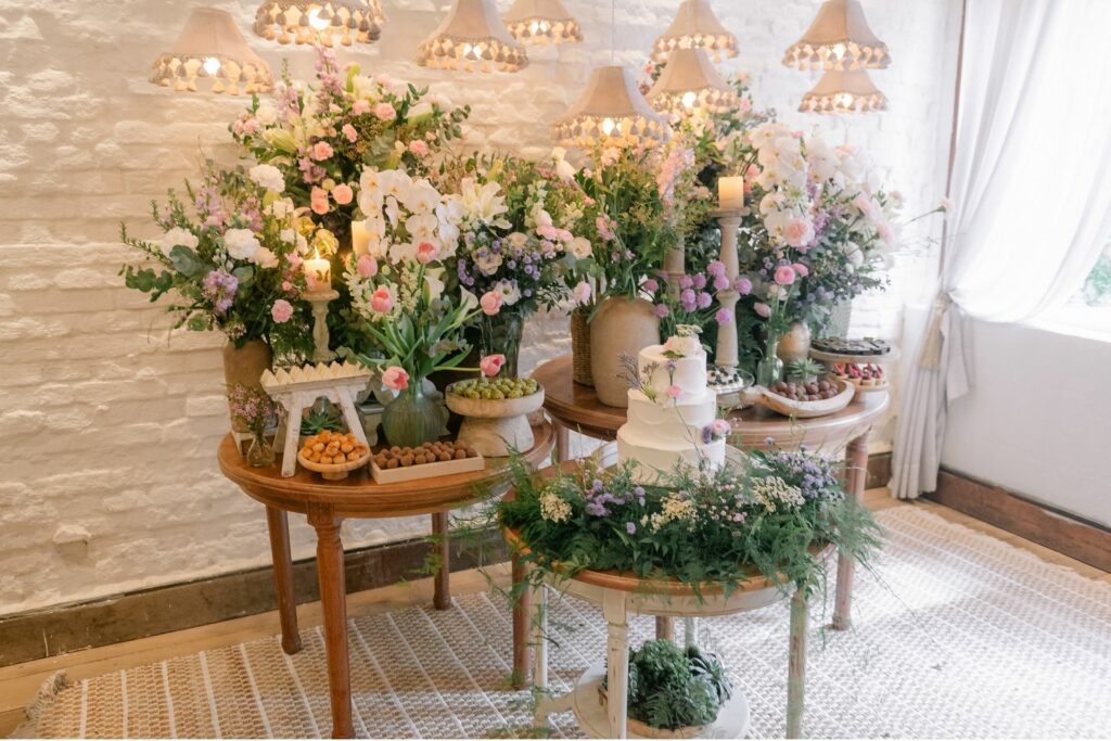 A disposição dos pontos de serviço também pode seguir a estética boho: ilhas decoradas com elementos naturais, mesas de madeira, arranjos baixos e iluminação suave. Tudo pensado para que os convidados circulem com liberdade e se sintam à vontade.