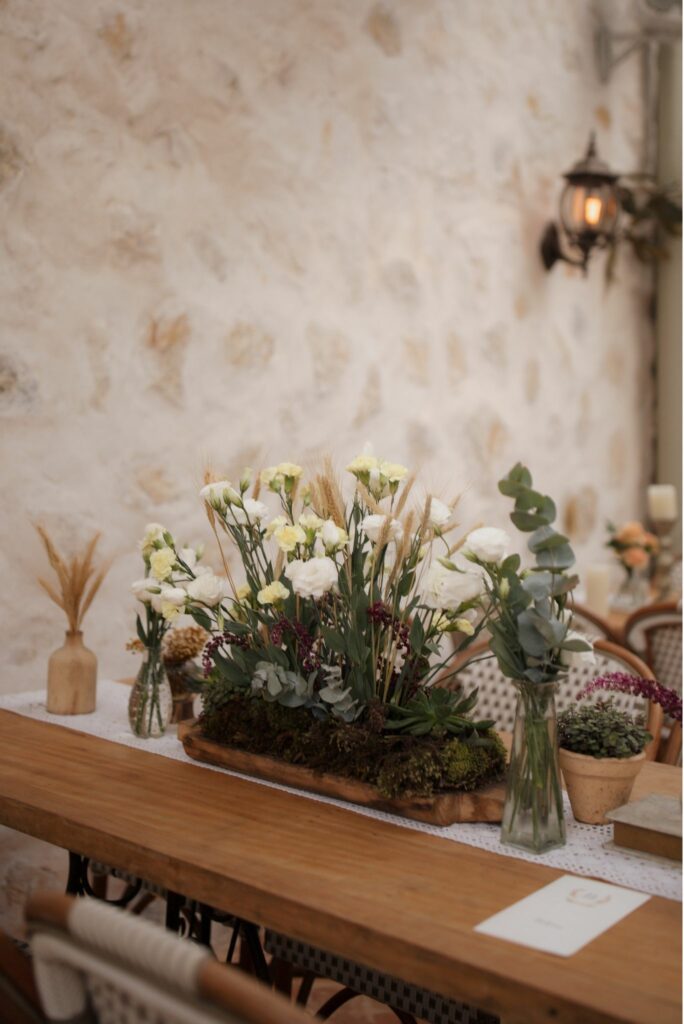 A rusticidade se expressa muito bem através das flores. Margaridas, girassóis, lavandas, astromélias e flores do campo trazem simplicidade e leveza. Já as flores mais nobres, como rosas, lírios e orquídeas, adicionam a dose de sofisticação que equilibra a composição.