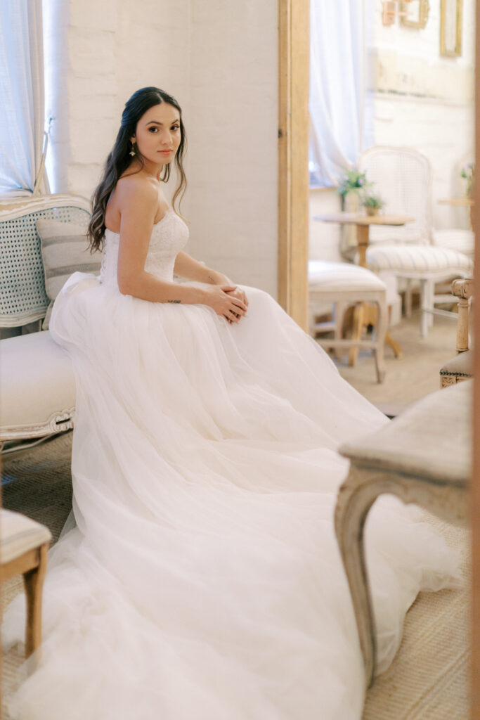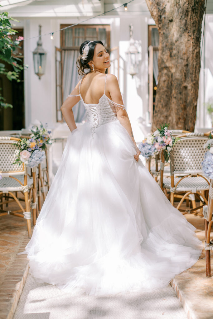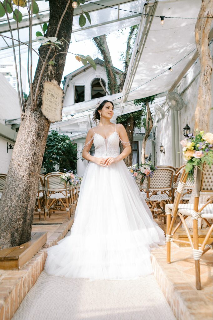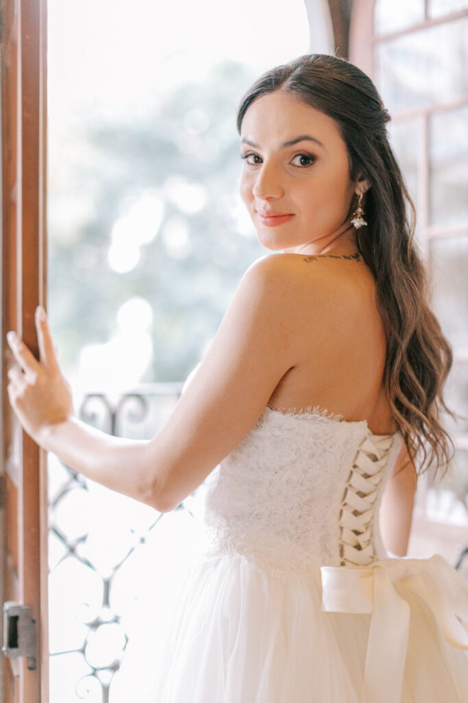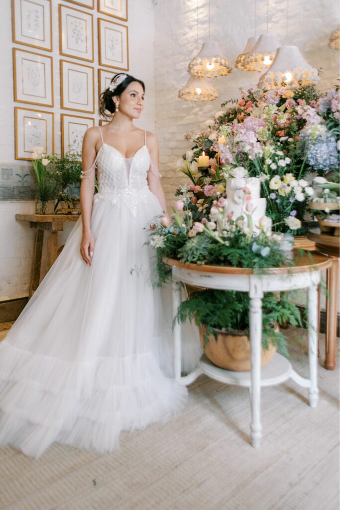 O primeiro olhar do editorial Grace traz delicadeza, movimento e uma pitada de encanto. Apresentamos o vestido Dália da Amora Bridal: corte em A, bordado com micro pérolas, alças finas e um laço no ombro que traduz o romantismo em sua forma mais moderna. A saia em camadas de tule parece flutuar, valorizando a silhueta com leveza e elegância.