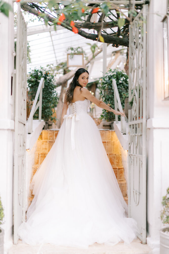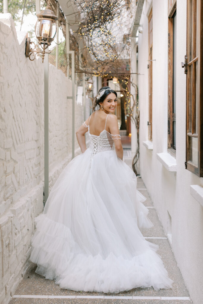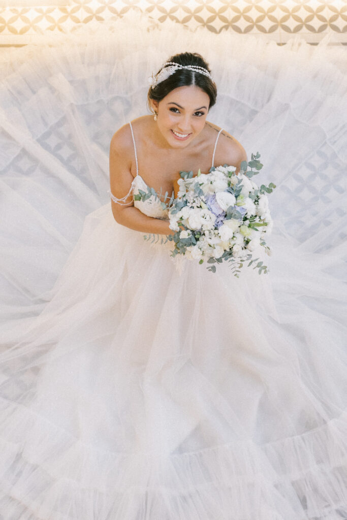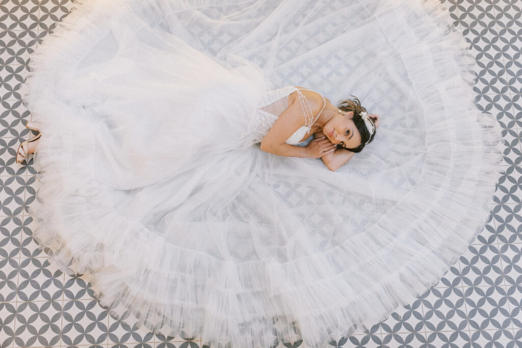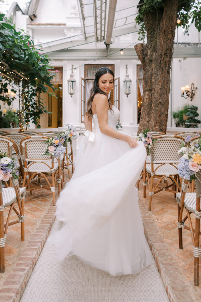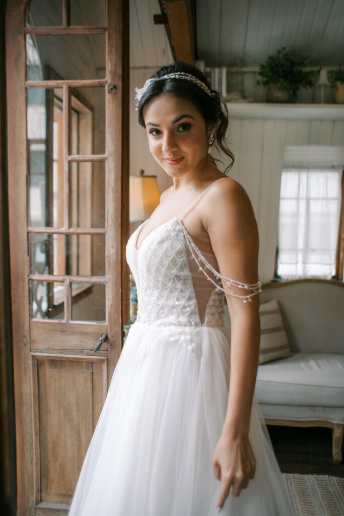 O primeiro olhar do editorial Grace traz delicadeza, movimento e uma pitada de encanto. Apresentamos o vestido Dália da Amora Bridal: corte em A, bordado com micro pérolas, alças finas e um laço no ombro que traduz o romantismo em sua forma mais moderna. A saia em camadas de tule parece flutuar, valorizando a silhueta com leveza e elegância.