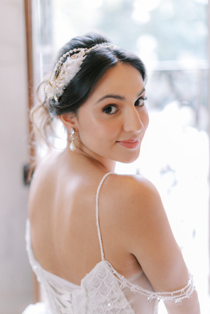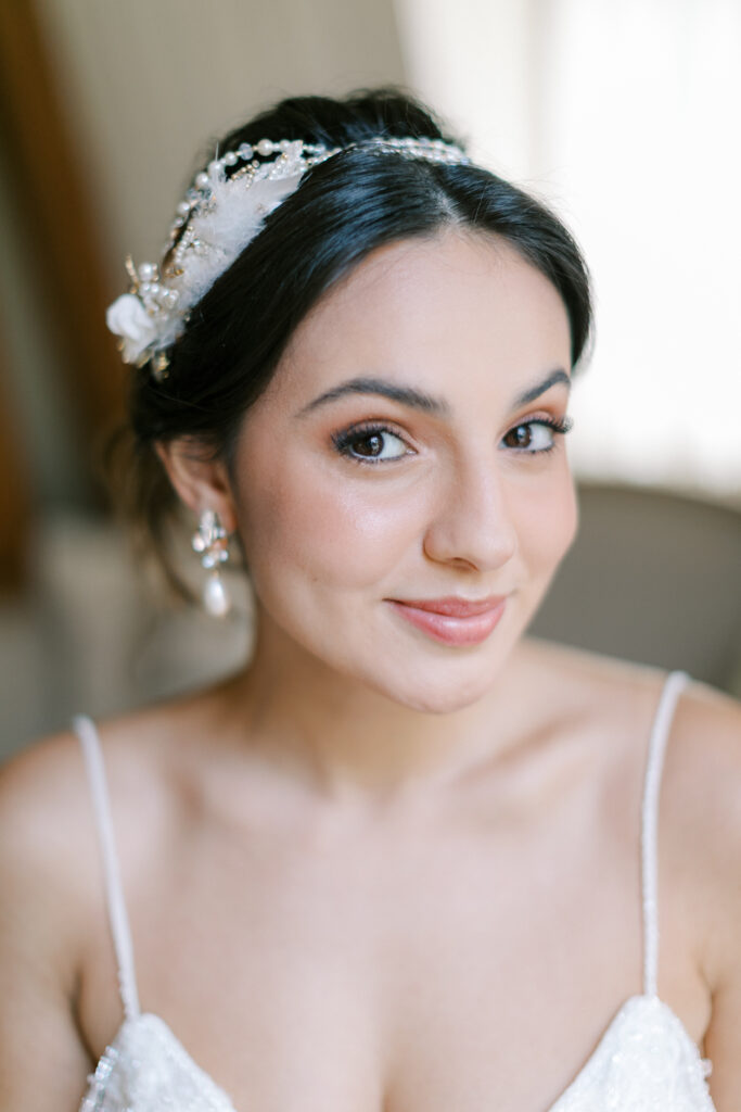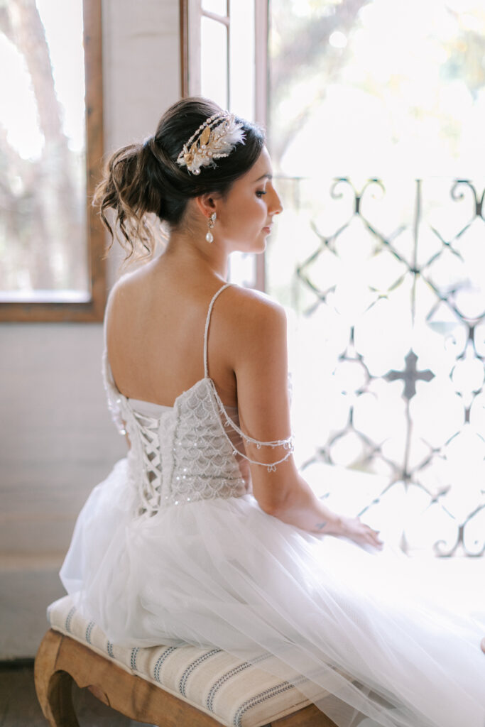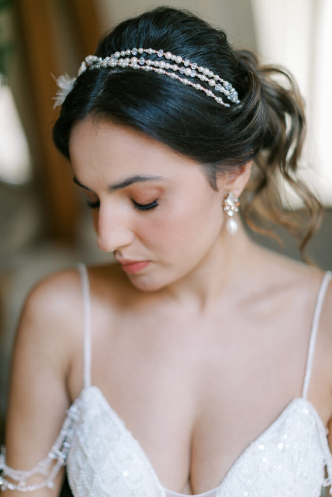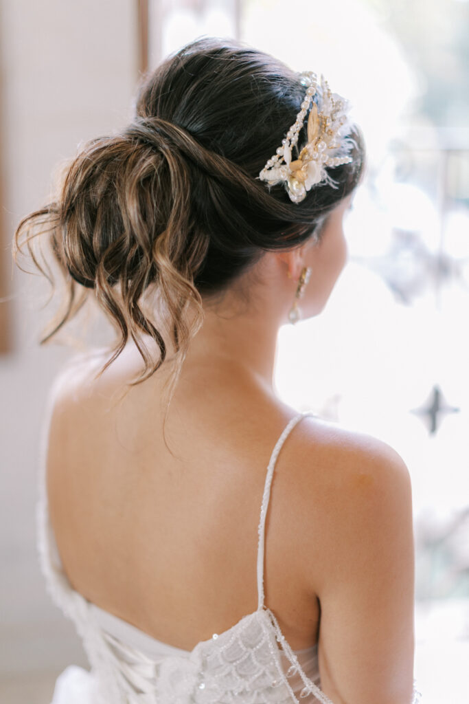 Nos cabelos presos com suavidade, o acessório Cordellia do Atelier Girardi completou o