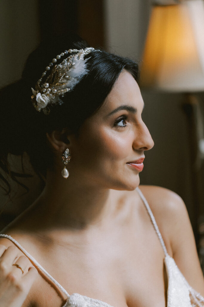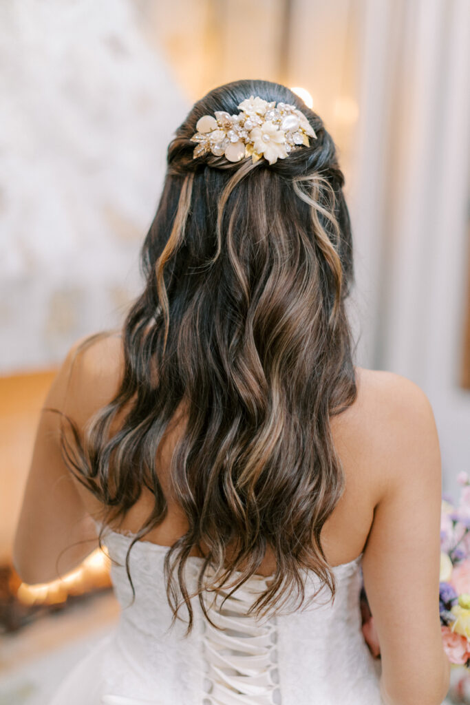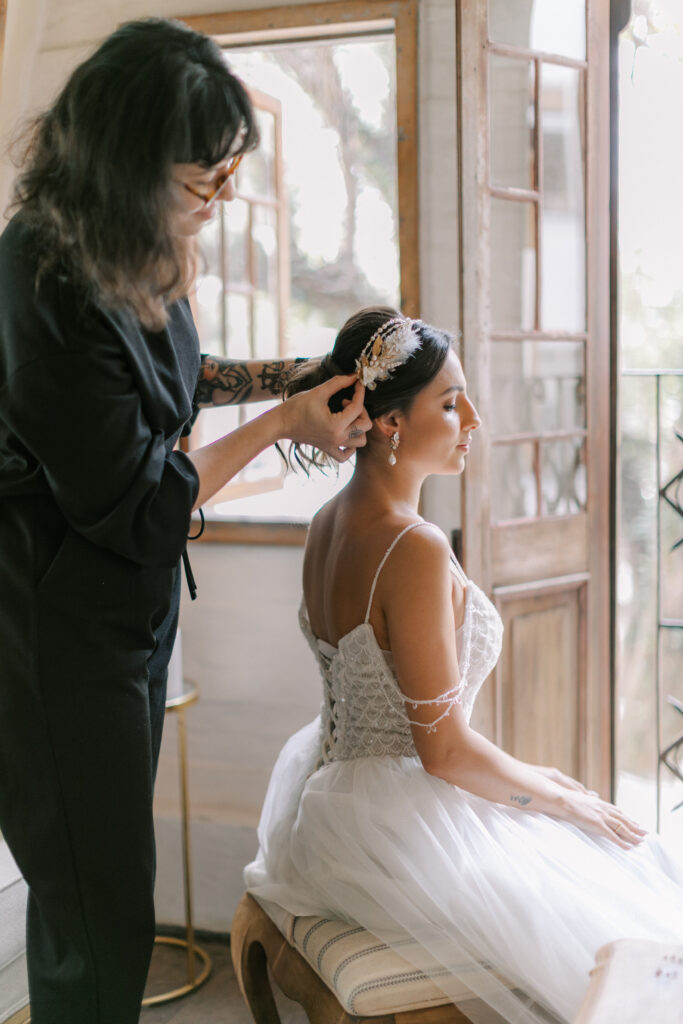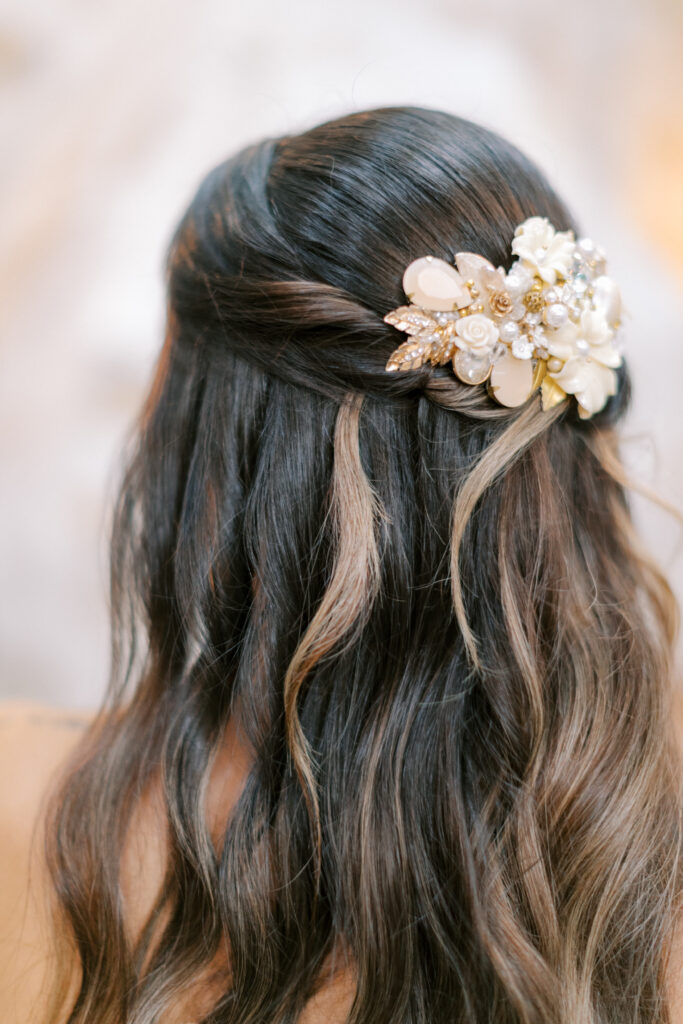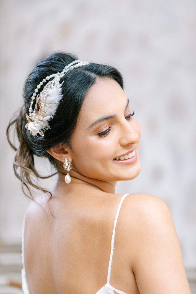 Nos cabelos presos com suavidade, o acessório Cordellia do Atelier Girardi completou o