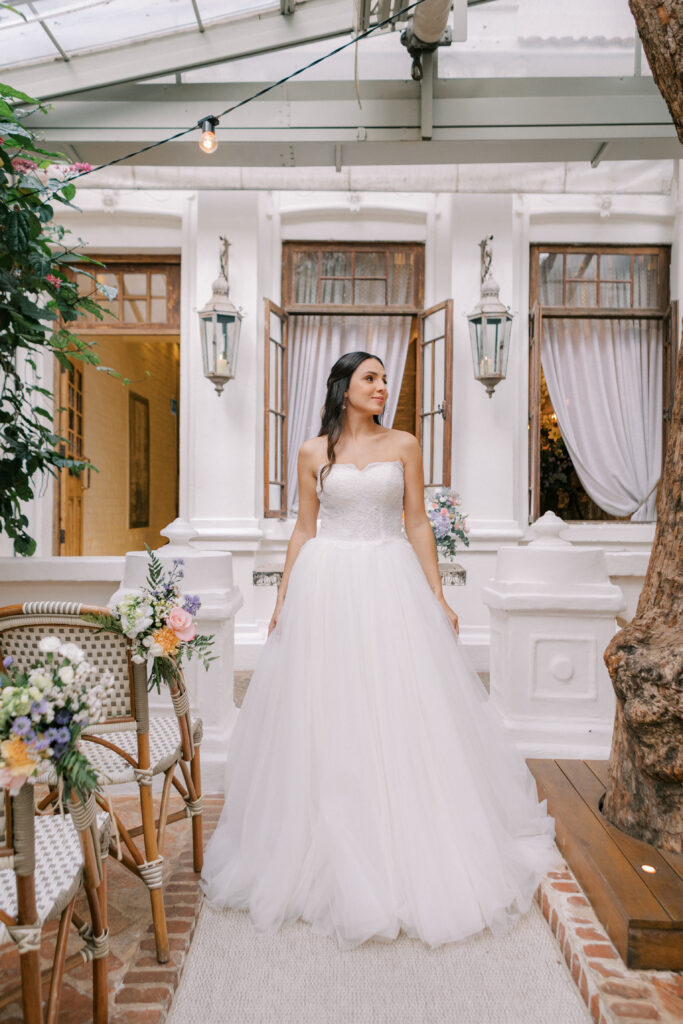 Para compor esse look, escolhemos o vestido Camélia da Amora Bridal, com seu modelo que une delicadeza e presença. O corpete em renda floral com decote coração desenha o busto com suavidade, enquanto a saia em tule volumosa traz movimento e leveza ao caminhar. Um laço de fita marca a cintura com um gesto final de ternura.