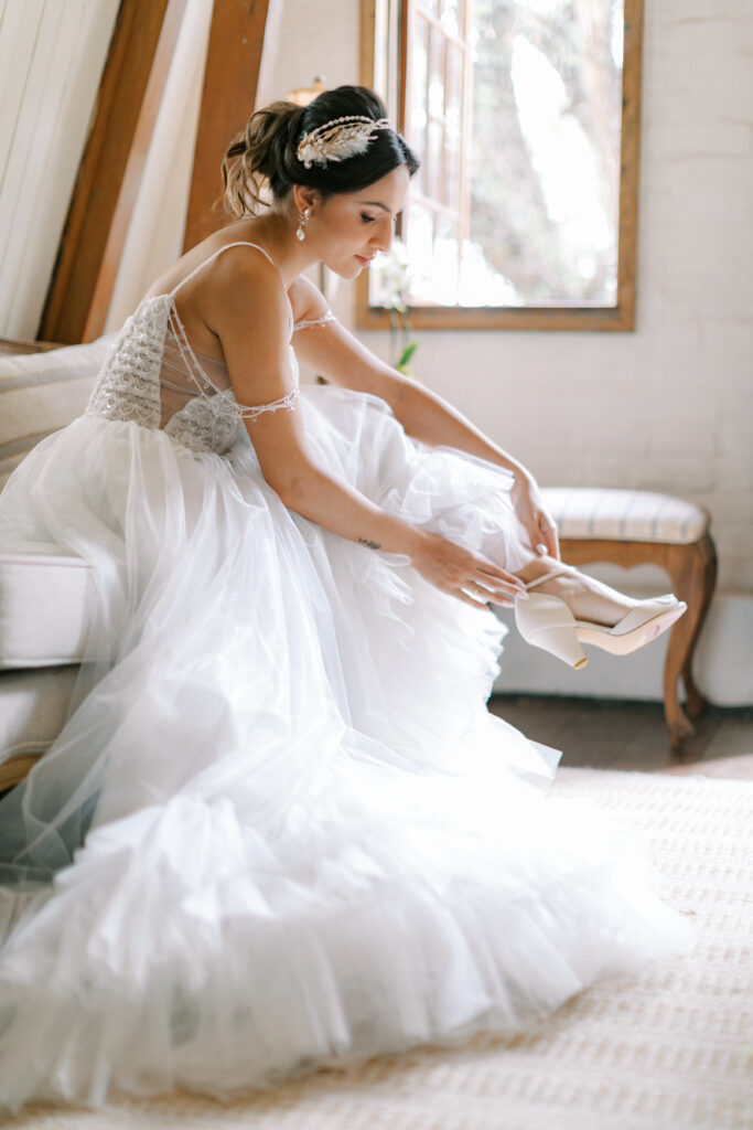 Finalizamos com a sandália Pétalas, da Ju Bicudo, no tom Aveia + Off White, salto médio de 6,5cm que une leveza, beleza e conforto. Um modelo criado para acompanhar a noiva com bem-estar em cada passo do grande dia.